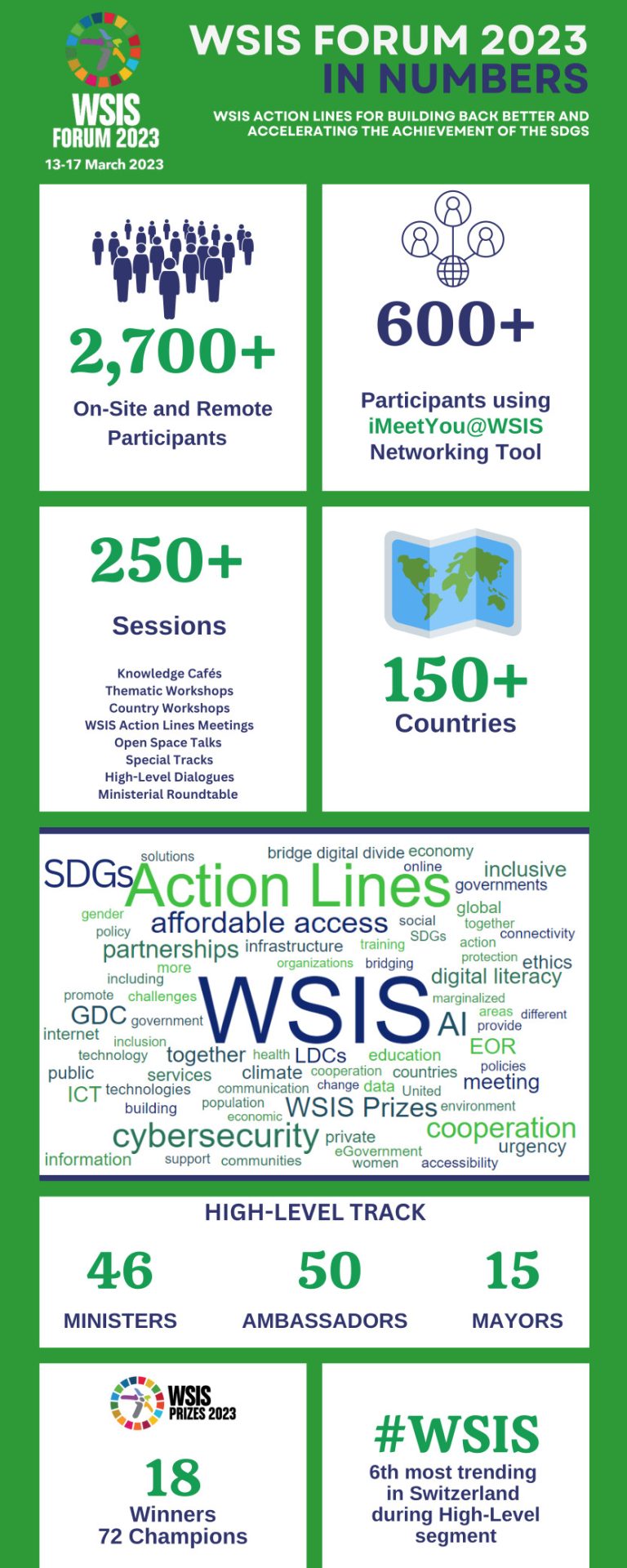 The WSIS Forum 2023 hybrid week was held from 13 to 17 March in Geneva, Switzerland, and brought together experts, policymakers, and diverse stakeholders from around the world to discuss information and communication technologies (ICTs) for sustainable development. This year’s Forum theme is WSIS Action Lines for building back better and accelerating The Forum hybrid week welcomed over 2,700 participants attending both on-site and remotely, from 150 countries worldwide. The Forum gathered more than 150 high-level representatives of the wider WSIS stakeholder community, including Ministers and Deputies, Ambassadors; and leaders from the private sector, academia and civil society.